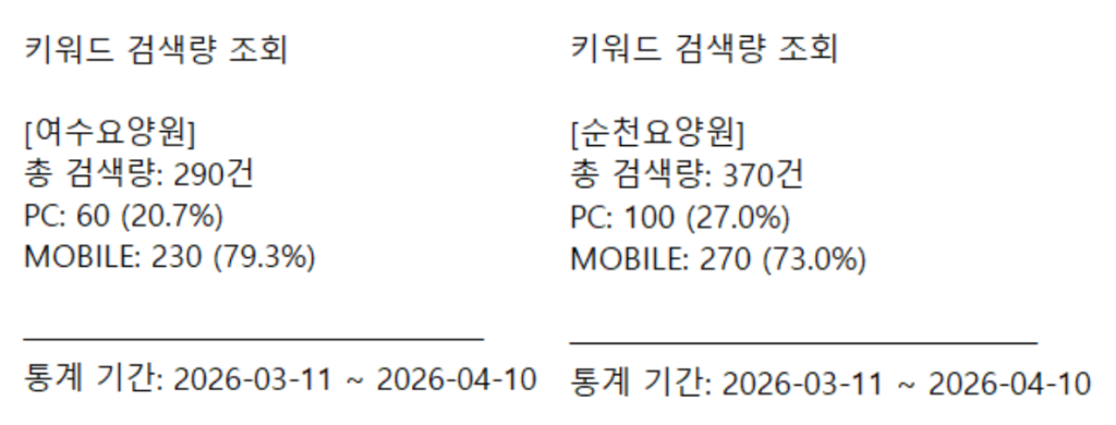 실제로 여수 요양원 관련 검색 흐름을 보면, 지역 내에서 온라인 마케팅을 아주 적극적으로 운영하는 기관이 많은 편은 아니기 때문에 블로그, 플레이스, 홈페이지 같은 기본 채널만 체계적으로 관리해도 눈에 띄는 차이를 만들 가능성이 있습니다. 경쟁이 심해진 뒤에 시작하면 더 많은 시간과 비용이 들어갈 수 있지만, 아직 자리를 선점할 수 있는 시기에는 상대적으로 효율적으로 기반을 만들 수 있습니다.