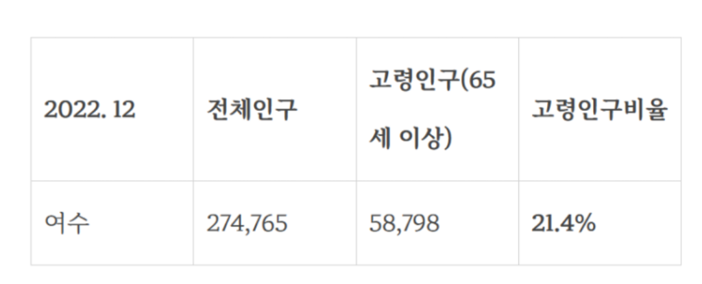 2022년 기존 자료 기준으로 살펴보면 여수는 전체 인구 274,765명, 고령인구(65세 이상)는 58,798명, 고령인구 비율은 21.4%로 나타납니다. 고령인구 비중이 높은 지역이라는 점은 장기요양기관 입장에서 중요한 의미가 있습니다.